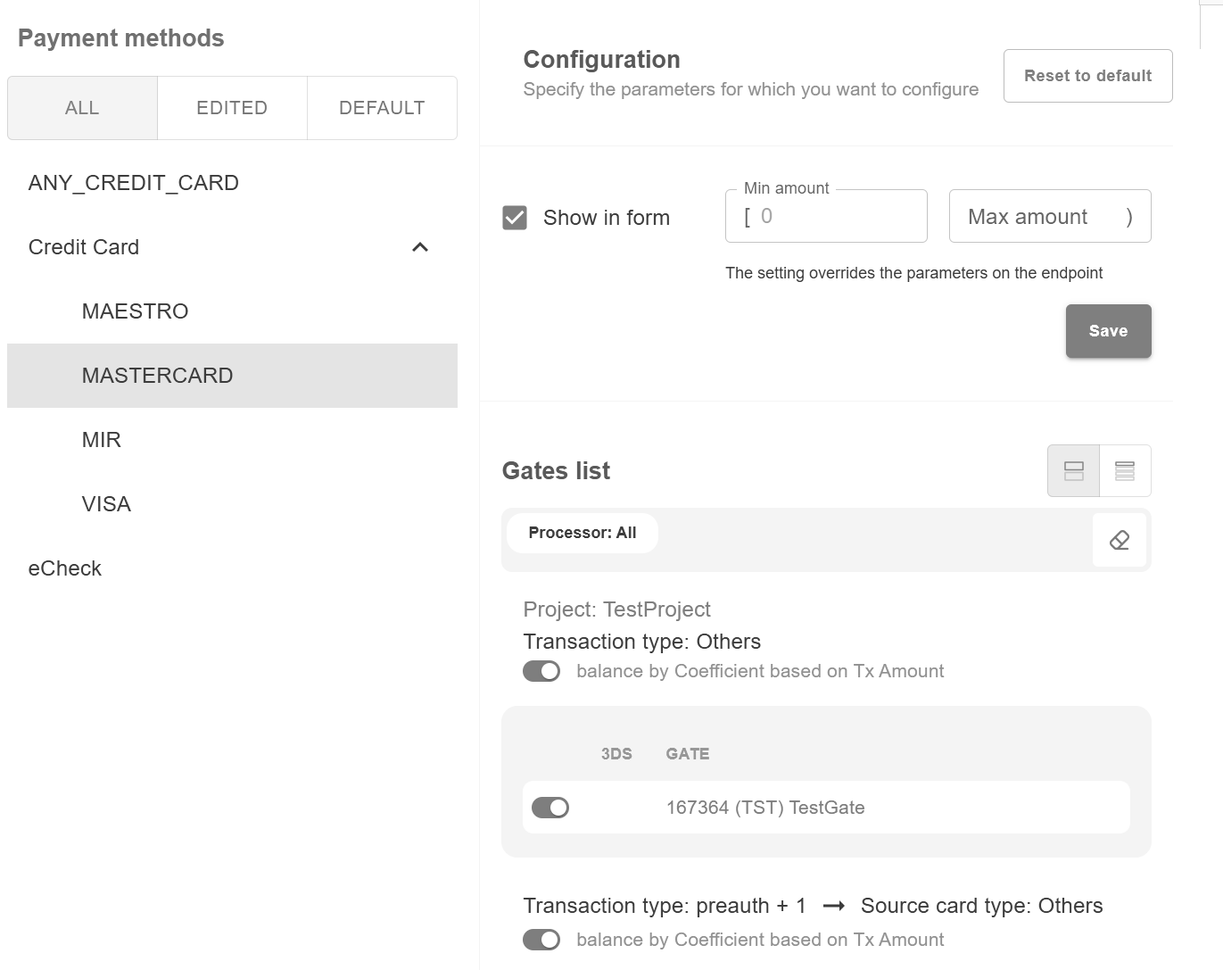 Press on Level Name to access Customer level configuration. In opened window select Level configuration to setup custom payment flow for Customer level or Filters to add additional checks for level.