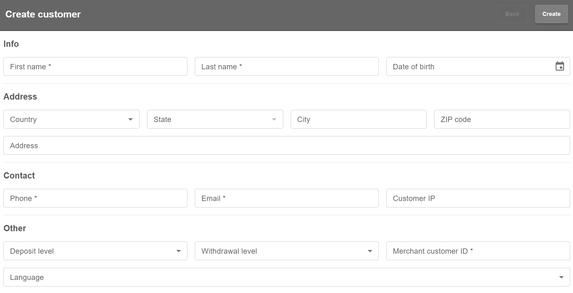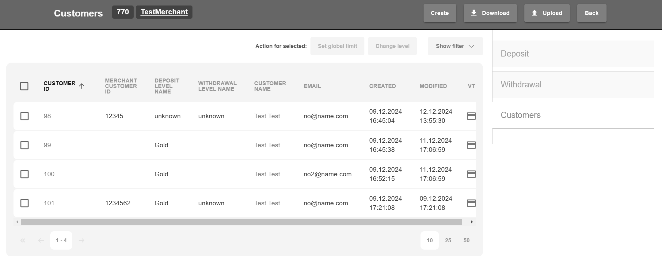 Individual configuration can be done for Customers. Depending on the parameter that were sent (customer_id, customer_level, merchant_customer_identifier), customer can be created automatically or manually through Customers screen. Press on Customers in order to access the Customers screen.