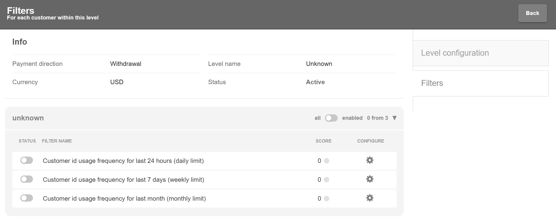 Unknown Level - In case if not configured customer level is present in API calls, Unknown level settings will be used.