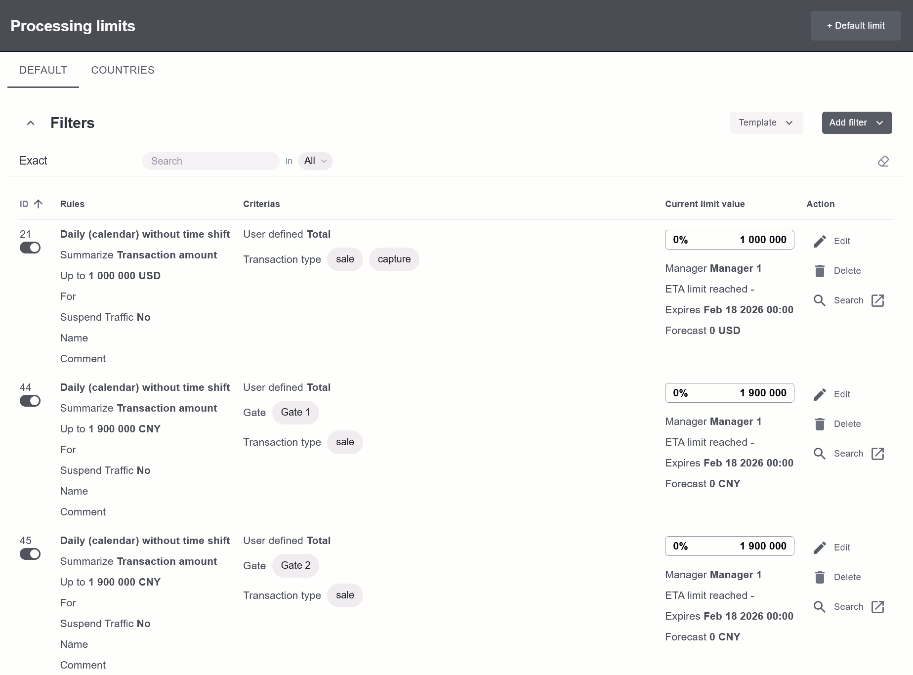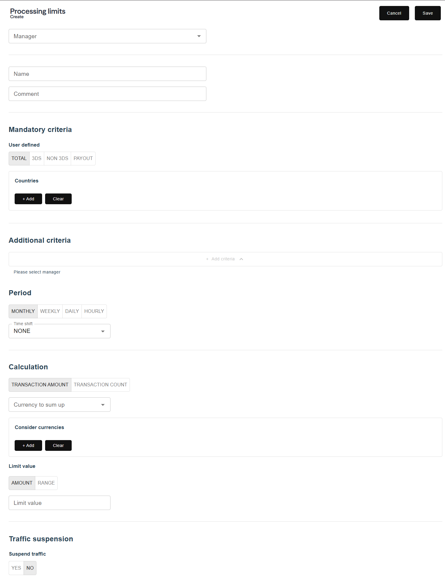 • Limit value - For Amount enter total transaction amount or transaction count for this limit. Limit doesn’t include settled value, if limit should be 15000 for it to be included value must be 15000.01. Range to make the limit amount less transparent.